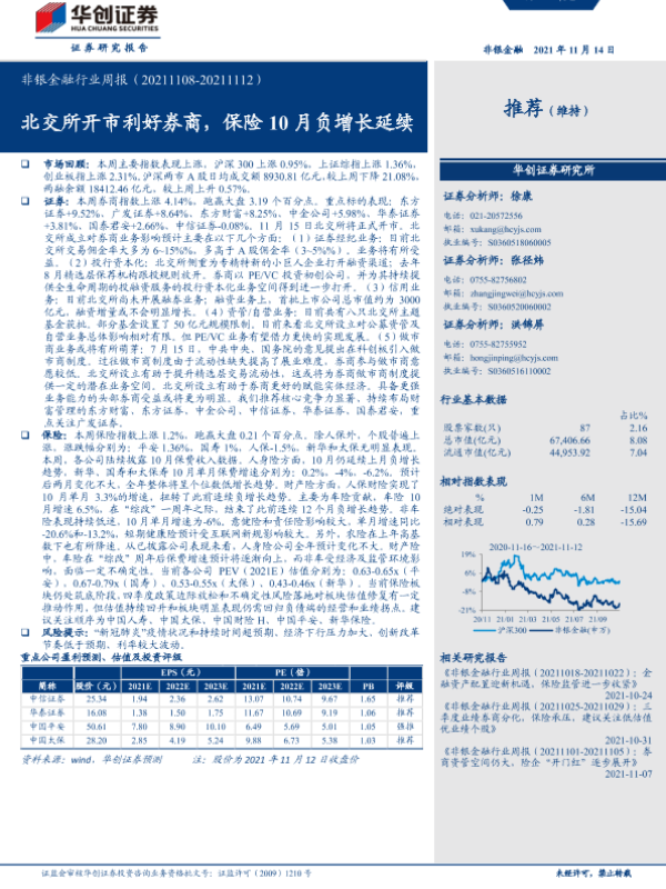 【华创证券】【20211114】非银金融行业周报:北交所开市利好券商,保险10月负增长延续-17页