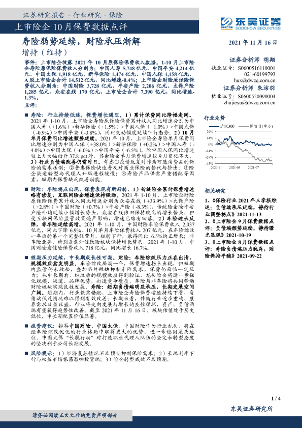 【东吴证券】【20211116】上市险企10月保费数据点评:寿险弱势延续,财险承压渐解-4页