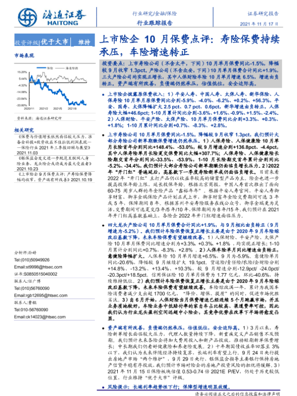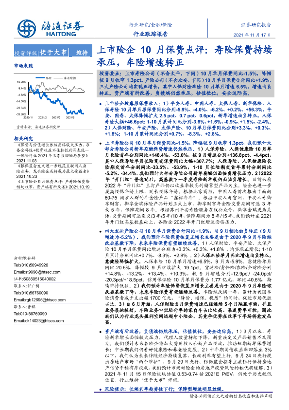 【海通证券】【20211117】上市险企10月保费点评:寿险保费持续承压,车险增速转正-5页