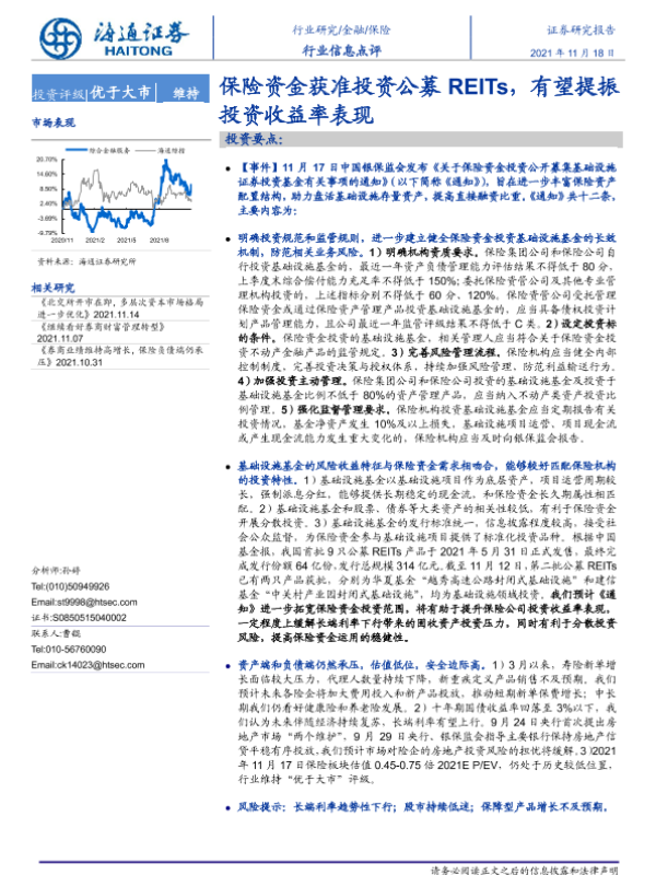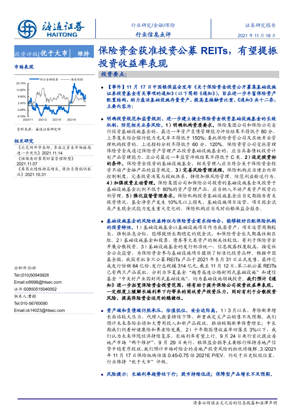 【海通证券】【20211118】保险行业信息点评:保险资金获准投资公募REITs,有望提振投资收益率表现-3页
