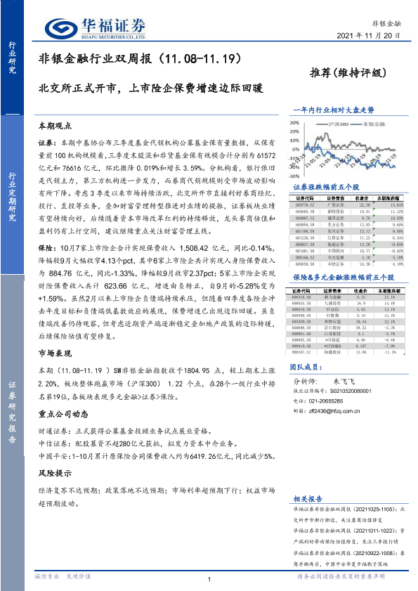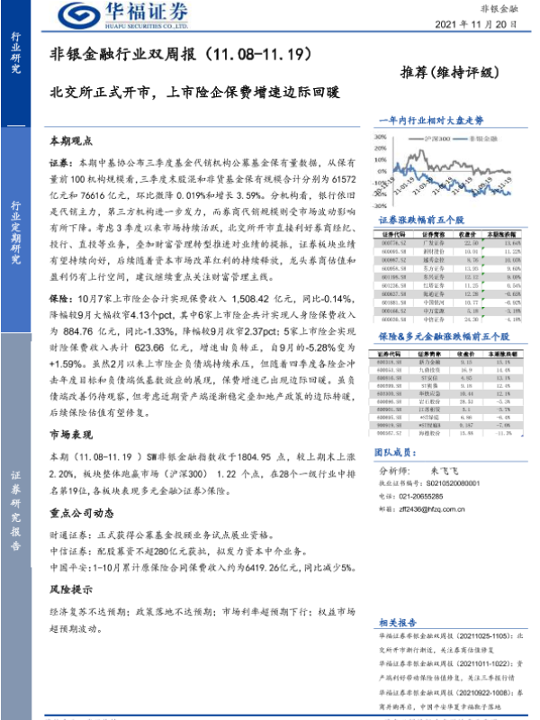 【华福证券】【20211120】非银金融行业双周报:北交所正式开市,上市险企保费增速边际回暖-11页