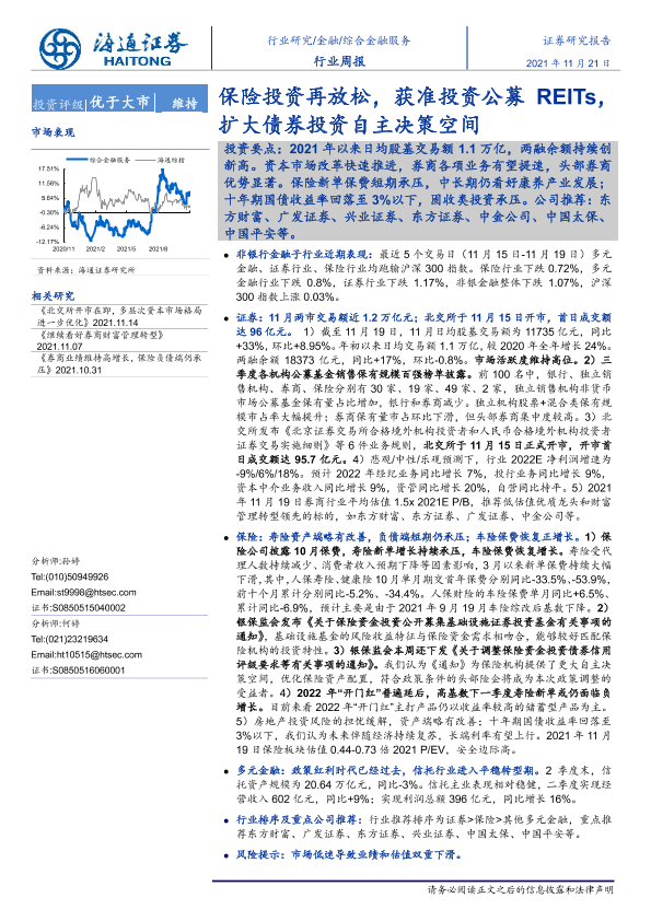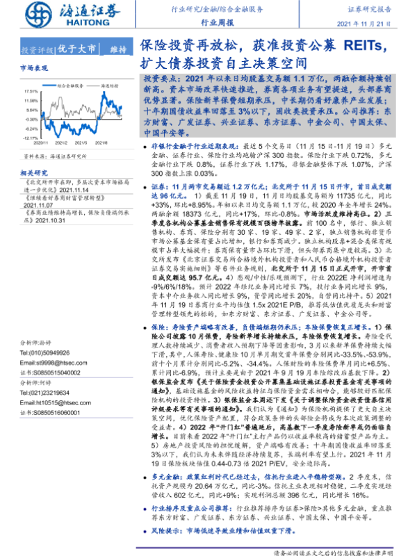【海通证券】【20211121】综合金融服务行业周报:保险投资再放松,获准投资公募REITs,扩大债券投资自主决策空间-11页