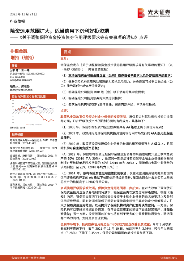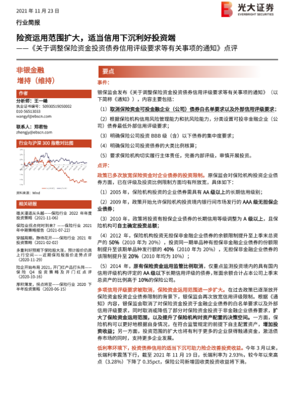 【光大证券】【20211123】关于调整保险资金投资债券信用评级要求等有关事项的通知点评:险资运用范围扩大,适当信用下沉利好投资端-4页