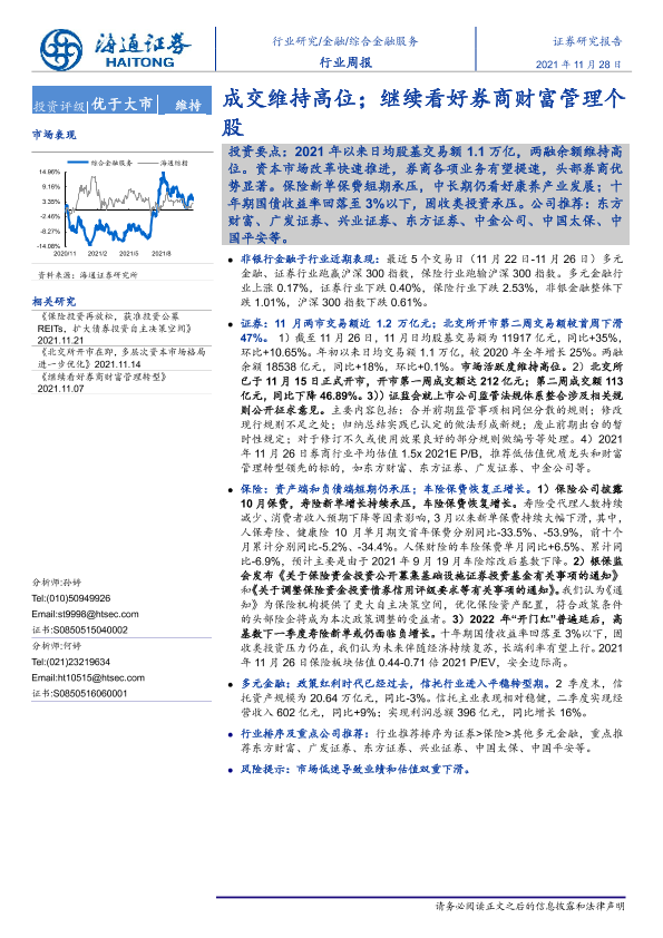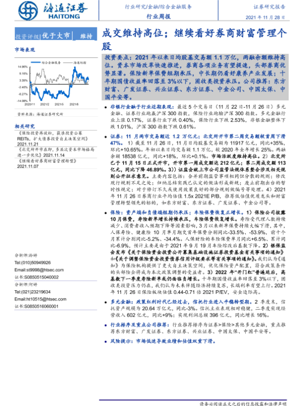 【海通证券】【20211128】金融行业周报:成交维持高位;继续看好券商财富管理个股-9页