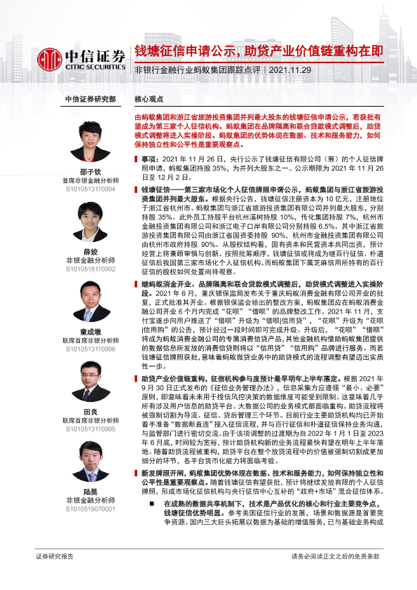 【中信证券】【20211129】非银行金融行业蚂蚁集团跟踪点评:钱塘征信申请公示,助贷产业价值链重构在即-4页