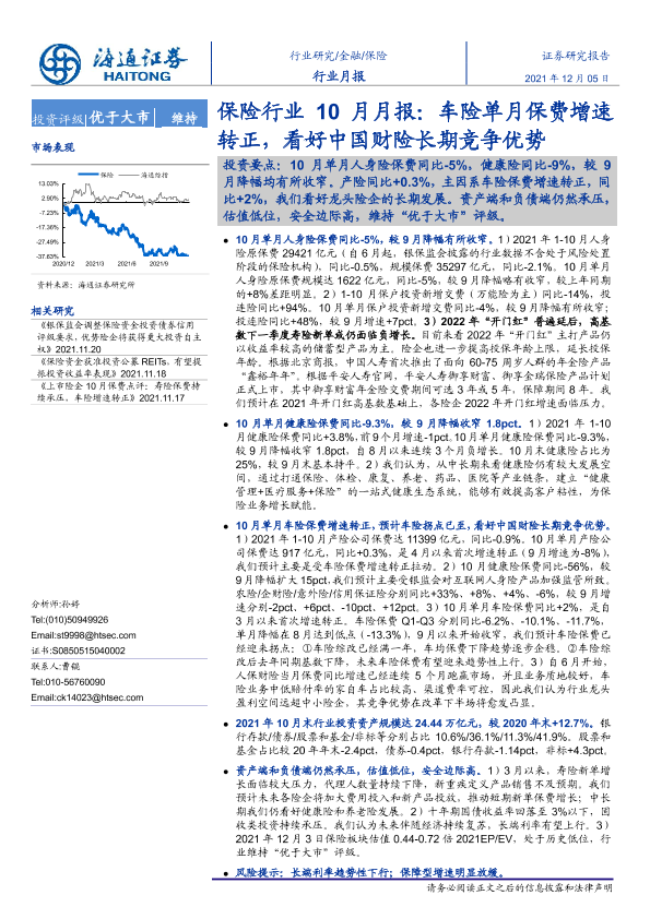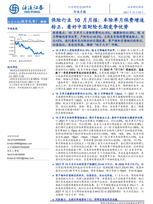 【海通证券】【20211205】保险行业10月月报:车险单月保费增速转正,看好中国财险长期竞争优势-6页