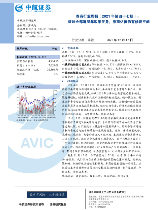 【中航证券】【20211217】券商行业周报(2021年第四十七期):证监会部署明年改革任务,券商估值仍有修复空间-5页