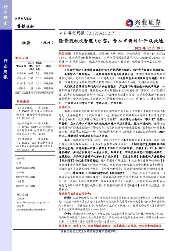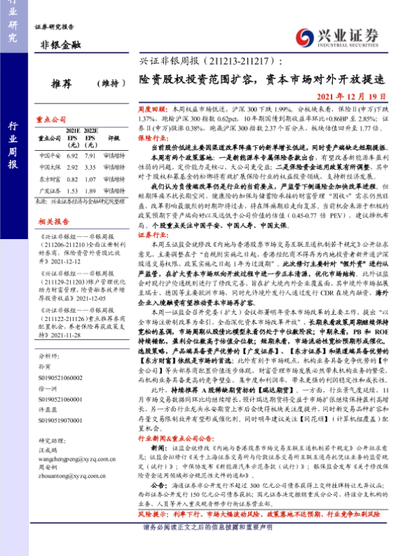 【兴业证券】【20211219】兴证非银周报:险资股权投资范围扩容,资本市场对外开放提速-15页