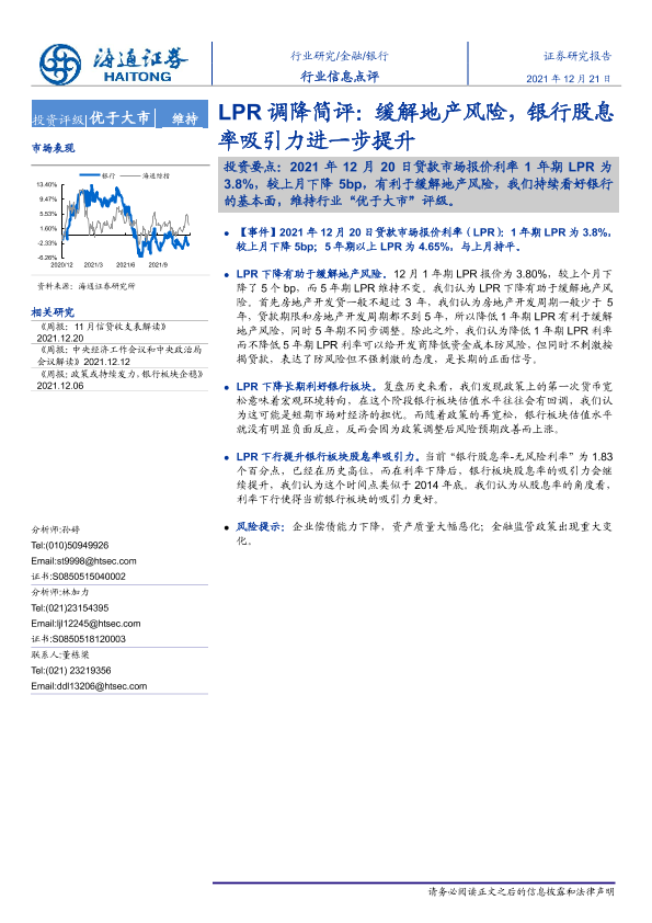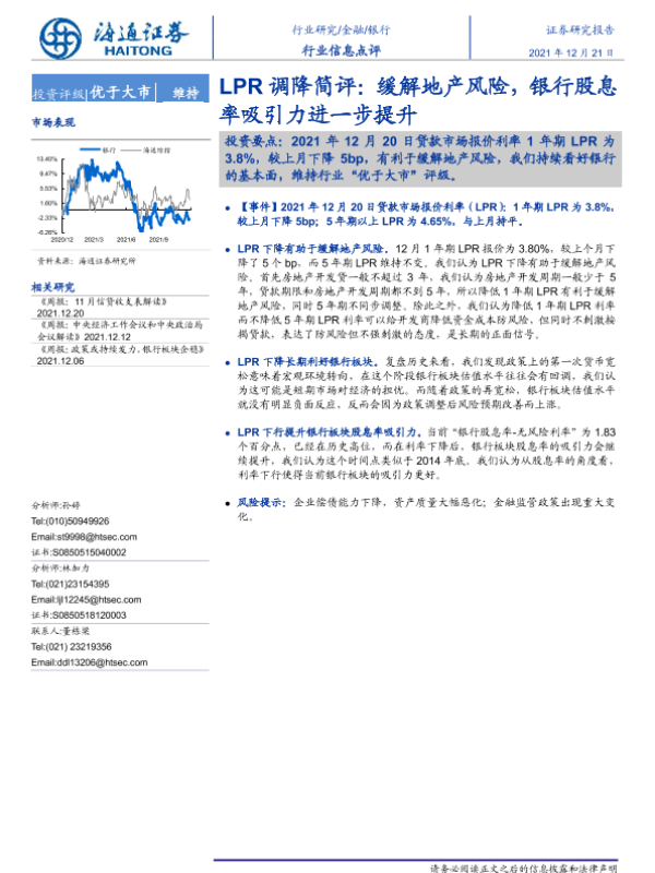 【海通证券】【20211221】银行LPR调降简评:缓解地产风险,银行股息率吸引力进一步提升-2页