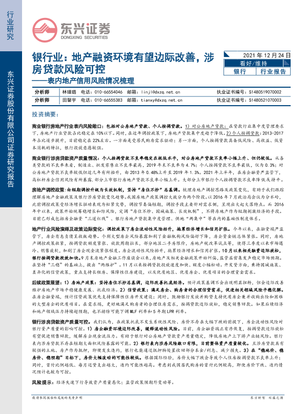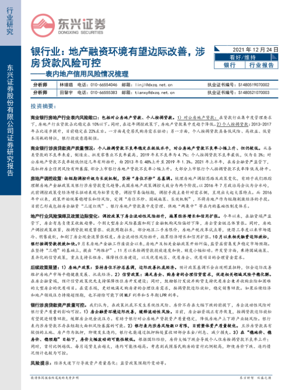 【东兴证券】【20211224】表内地产信用风险情况梳理:银行业:地产融资环境有望边际改善,涉房贷款风险可控-14页