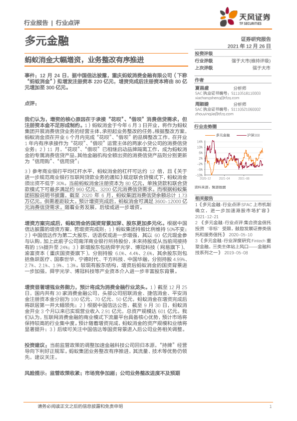 【天风证券】【20211226】多元金融行业点评:蚂蚁消金大幅增资,业务整改有序推进-2页