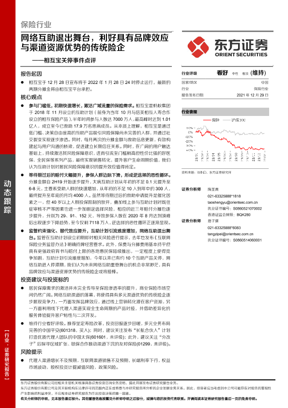 【东方证券】【20211229】保险行业:相互宝关停事件点评-网络互助退出舞台,利好具有品牌效应与渠道资源优势的传统险企-5页