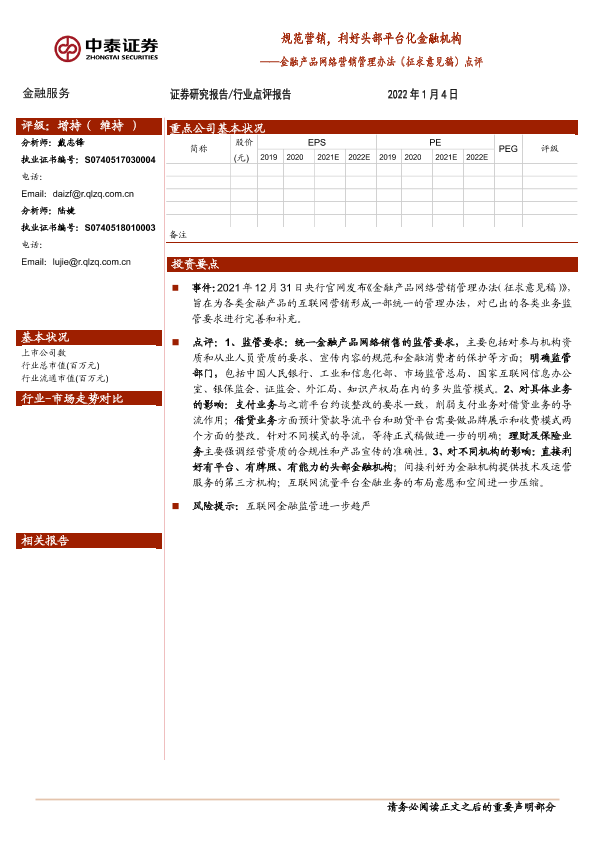 【中泰证券】【20220104】金融产品网络营销管理办法(征求意见稿)点评:规范营销,利好头部平台化金融机构-6页