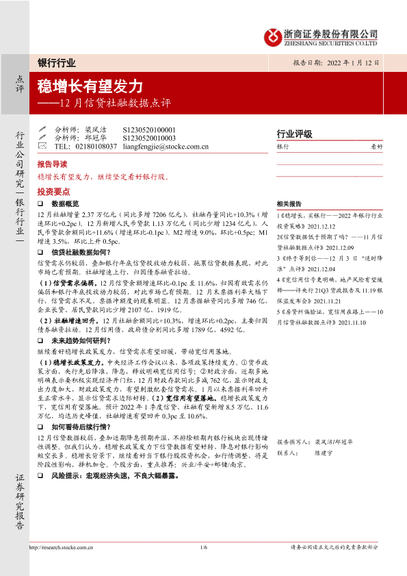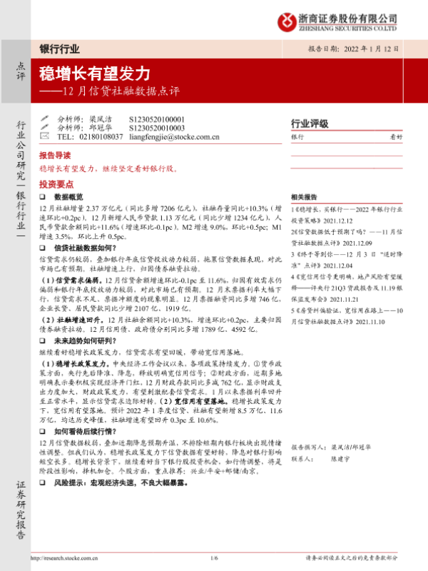 【浙商证券】【20220112】12月信贷社融数据点评:稳增长有望发力-6页