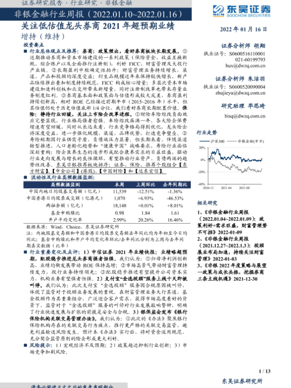 【东吴证券】【20220116】非银金融行业周报:关注低估值龙头券商2021年超预期业绩-13页