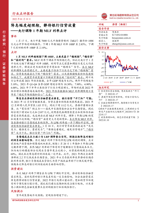 【东亚前海证券】【20220119】央行调降1年期MLF利率点评:降息幅度超预期,静待银行信贷放量-4页