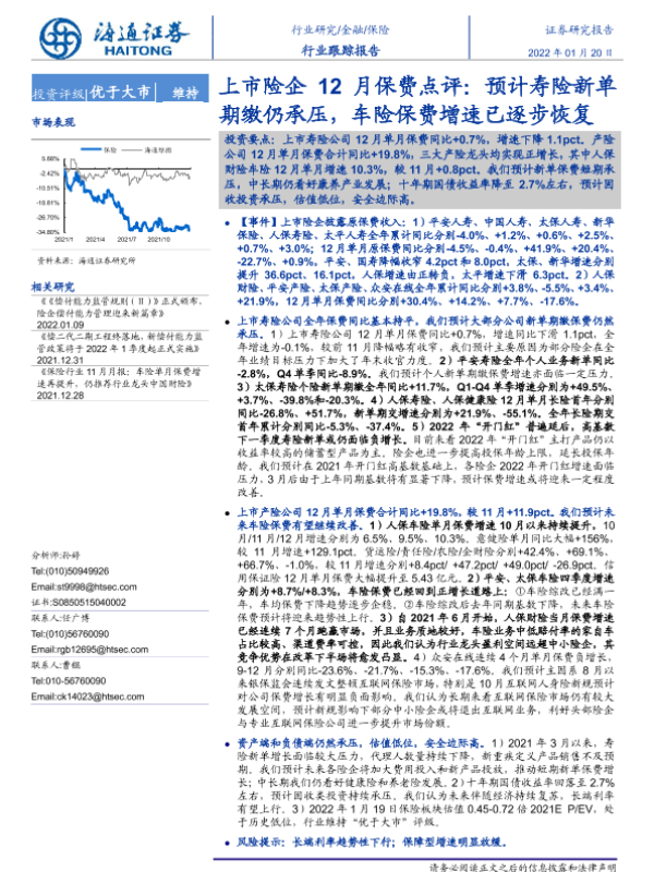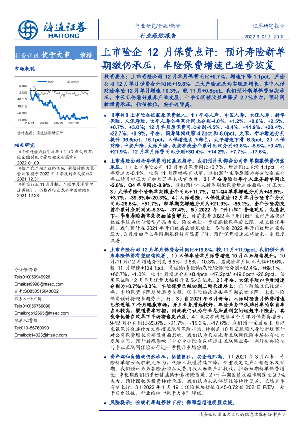 【海通证券】【20220120】上市险企12月保费点评:预计寿险新单期缴仍承压,车险保费增速已逐步恢复-5页