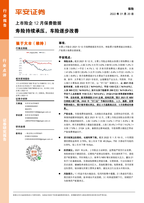 【平安证券】【20220120】保险上市险企12月保费数据:寿险持续承压,车险逐步改善-4页