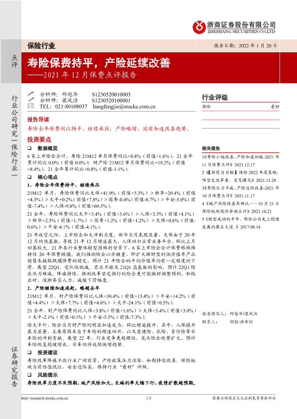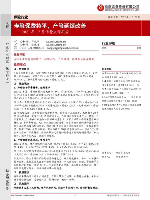 【浙商证券】【20220120】2021年12月保费点评报告:寿险保费持平,产险延续改善-3页