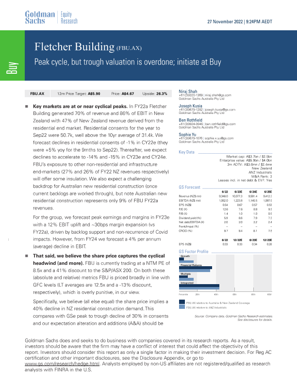 【Goldman Sachs】【20221127】Fletcher Building (FBU.AX) - Peak cycle, but trough valuation is overdone; initiate at Buy-29页