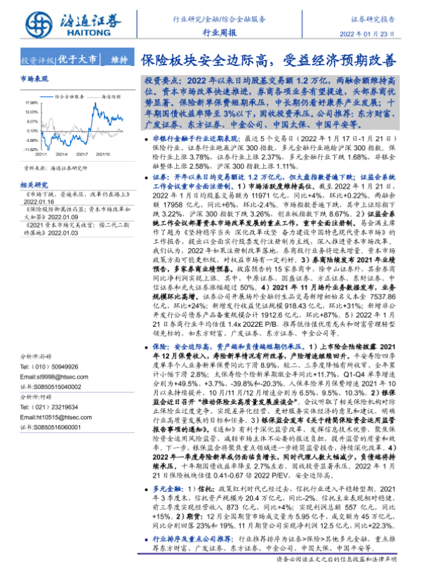 【海通证券】【20220123】综合金融服务行业周报:保险板块安全边际高,受益经济预期改善-12页