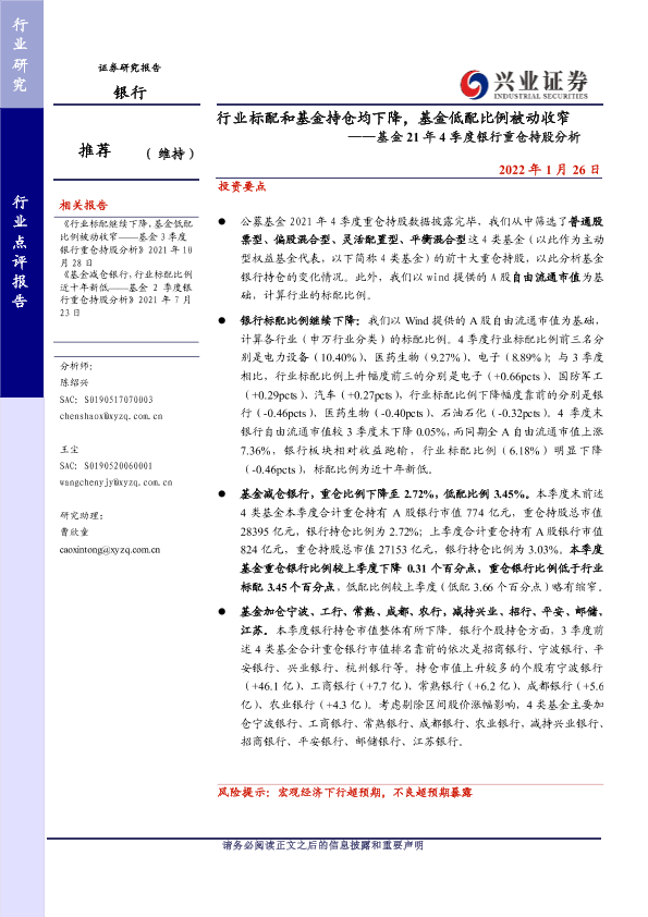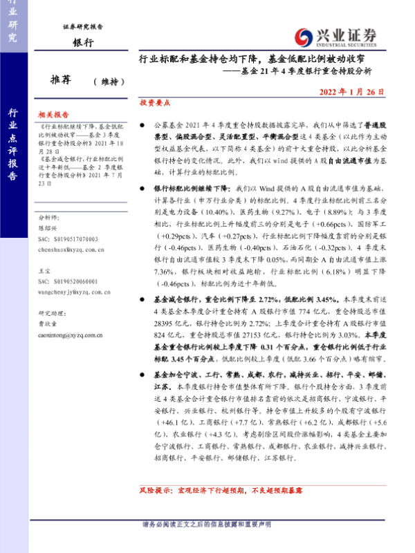 【兴业证券】【20220126】行业标配和基金持仓均下降,基金低配比例被动收窄——基金21年4季度银行重仓持股分析-6页