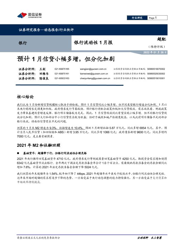 【国信证券】【20220126】银行流动性1月报:预计1月信贷小幅多增,但分化加剧-7页