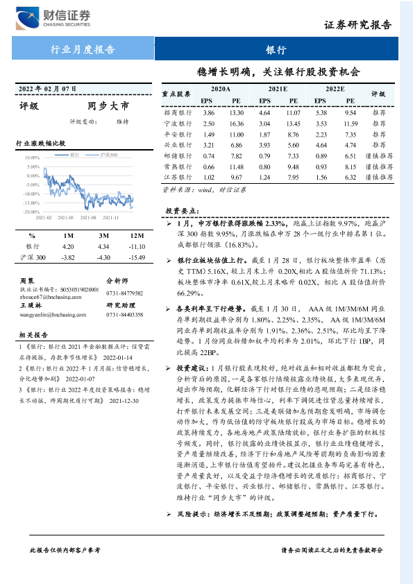 【财信证券】【20220207】银行行业月度报告:稳增长明确,关注银行股投资机会-8页