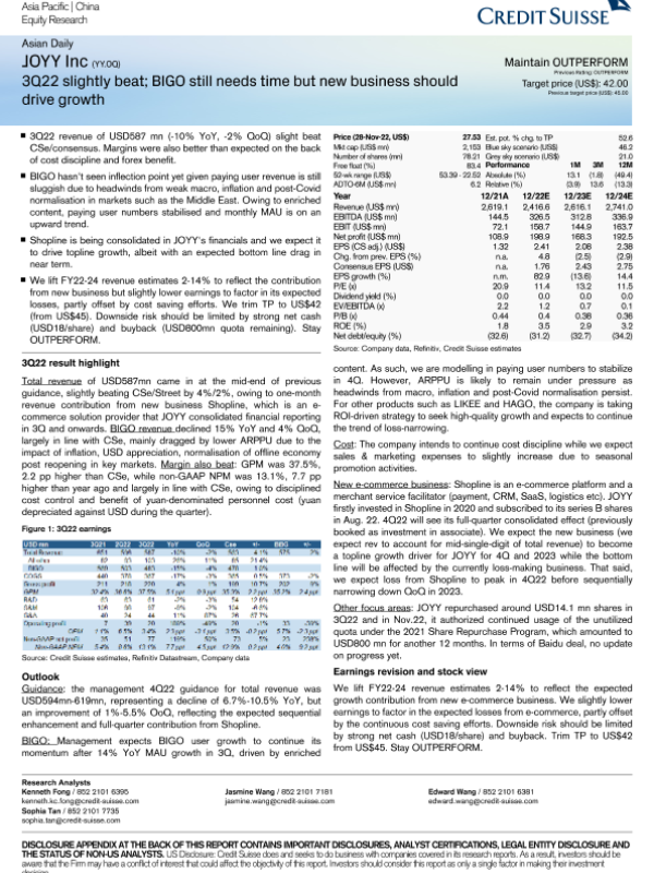 【Credit Suisse】【20221129】JOYY Inc (YY.OQ) 3Q22业绩及展望-5页