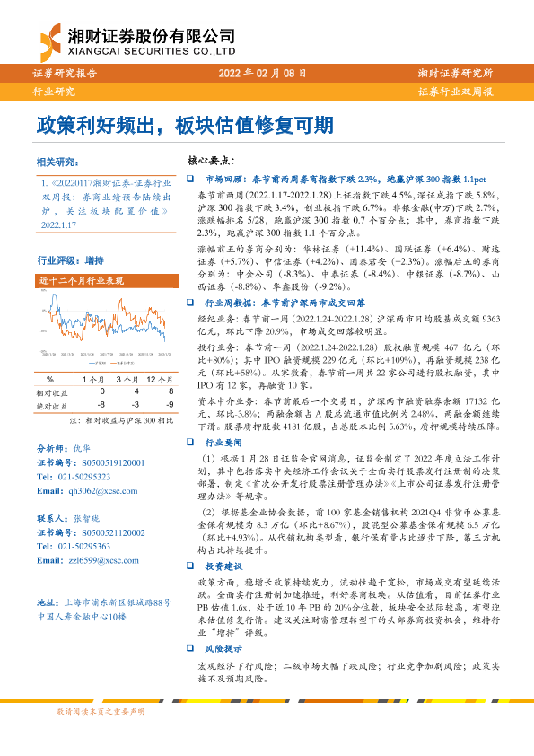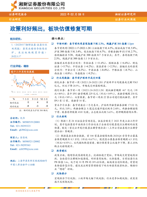【湘财证券】【20220208】证券行业双周报:政策利好频出,板块估值修复可期-9页