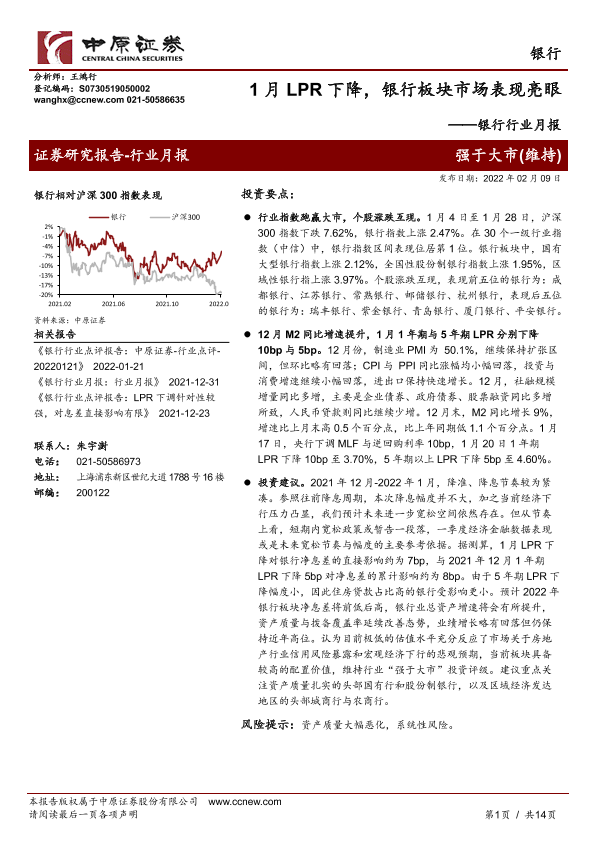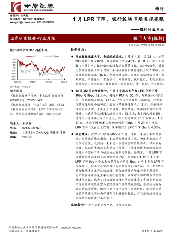 【中原证券】【20220209】1月LPR下降,银行板块市场表现亮眼-14页