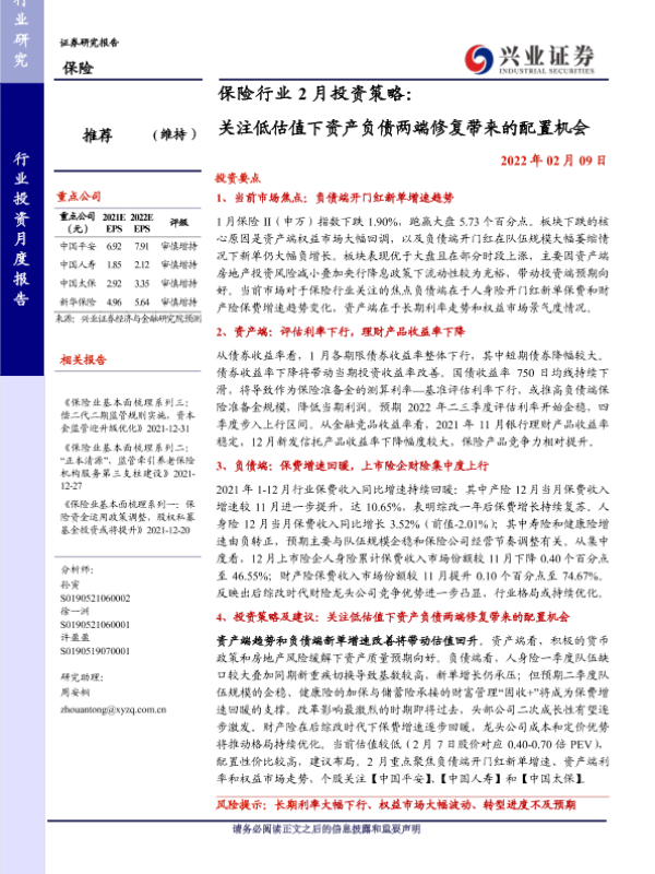 低估值 保险行业 投资策略 资产负债修复 配置机会