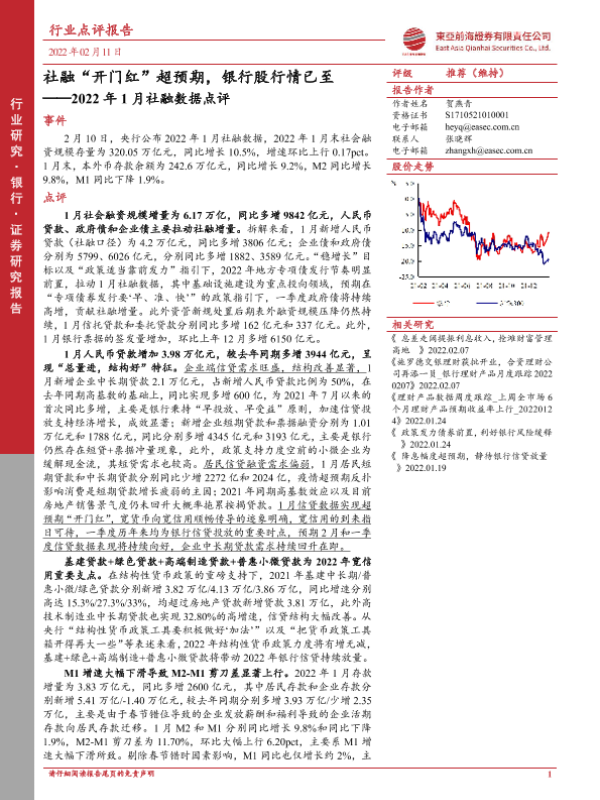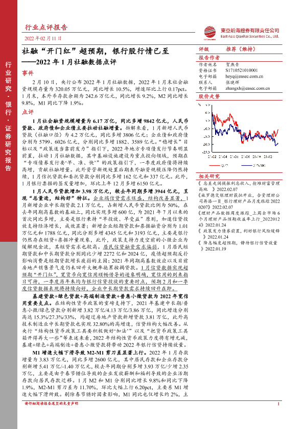 【东亚前海证券】【20220211】2022年1月社融数据点评:社融“开门红”超预期,银行股行情已至-9页
