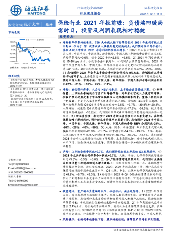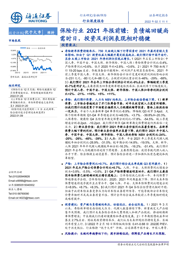 【海通证券】【20220211】保险行业2021年报前瞻:负债端回暖尚需时日,投资及利润表现相对稳健-20页