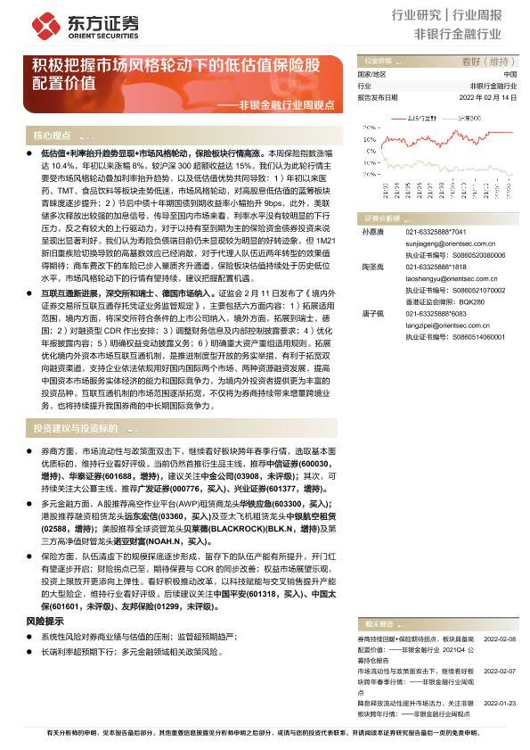 【东方证券】【20220214】非银金融行业周观点:积极把握市场风格轮动下的低估值保险股配置价值-15页