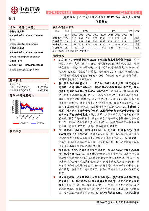 【中泰证券】【20220213】银行周度跟踪:21年行业净利润同比增12.6%,北上资金持续增持银行-18页