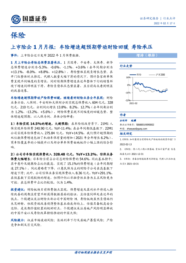 【国盛证券】【20220217】保险上市险企1月月报:车险增速超预期带动财险回暖 寿险承压-4页