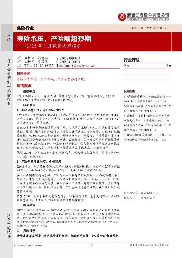 【浙商证券】【20220218】2022年1月保费点评报告:寿险承压,产险略超预期-3页