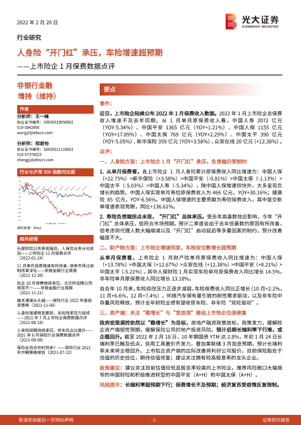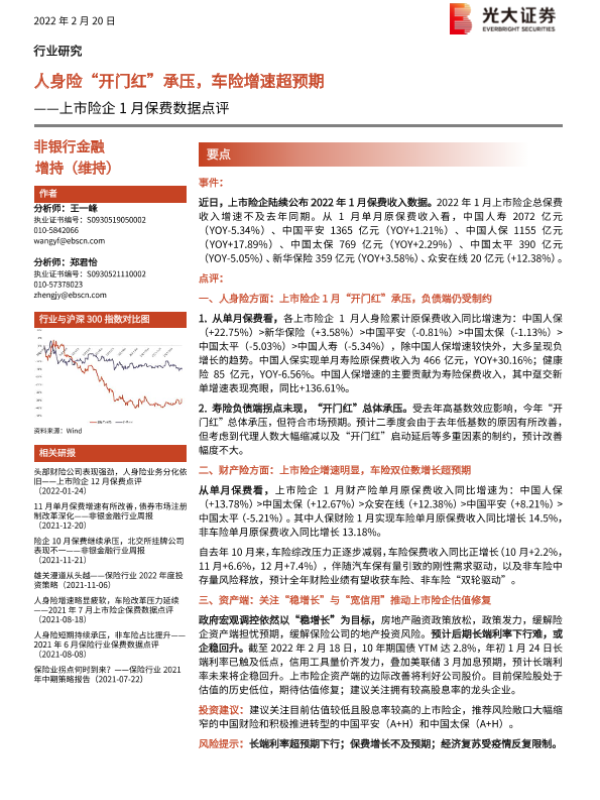 【光大证券】【20220220】上市险企1月保费数据点评:人身险“开门红”承压,车险增速超预期-3页