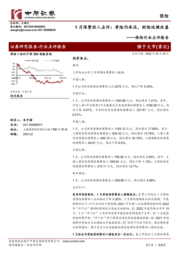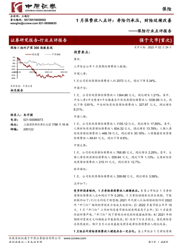 【中原证券】【20220224】1月保费收入点评:寿险仍承压,财险延续改善-6页