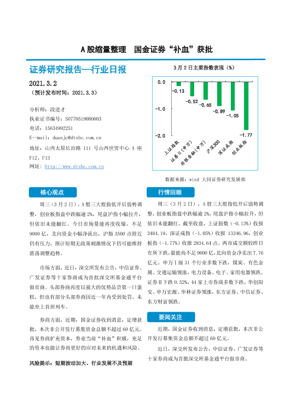 【大同证券】【20220302】非银金融行业日报:A股缩量整理,国金证券“补血”获批-11页