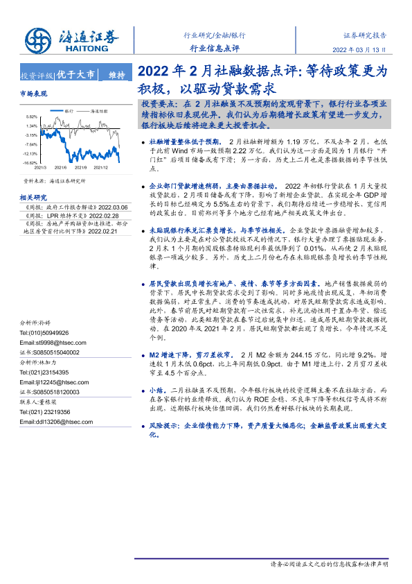 【海通证券】【20220313】2022年2月社融数据点评:等待政策更为积极,以驱动贷款需求-2页