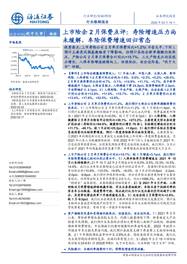 【海通证券】【20220316】上市险企2月保费点评:寿险增速压力尚未缓解,车险保费增速回归常态-5页