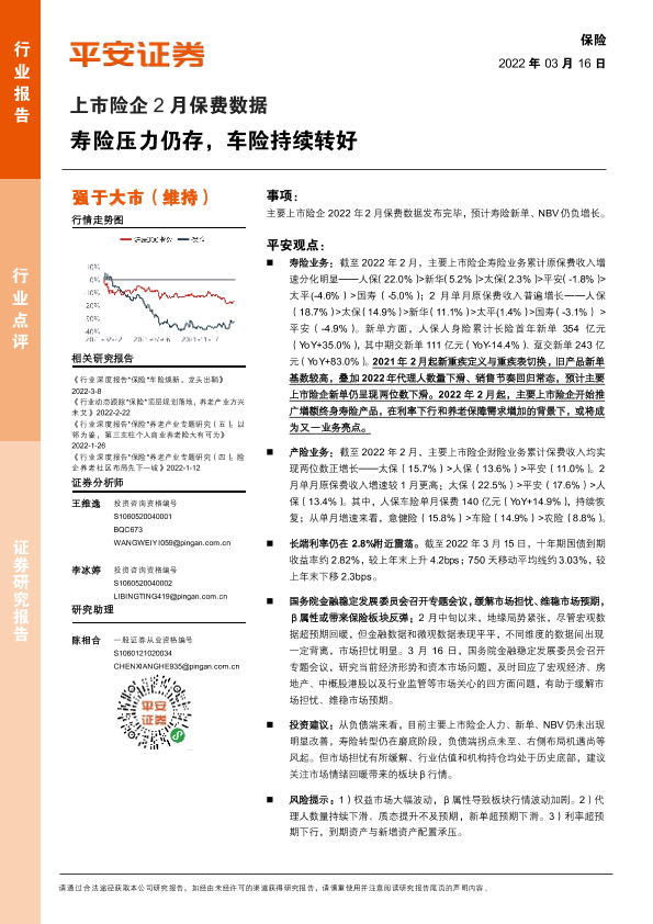 【平安证券】【20220316】上市险企2月保费数据:寿险压力仍存,车险持续转好-3页