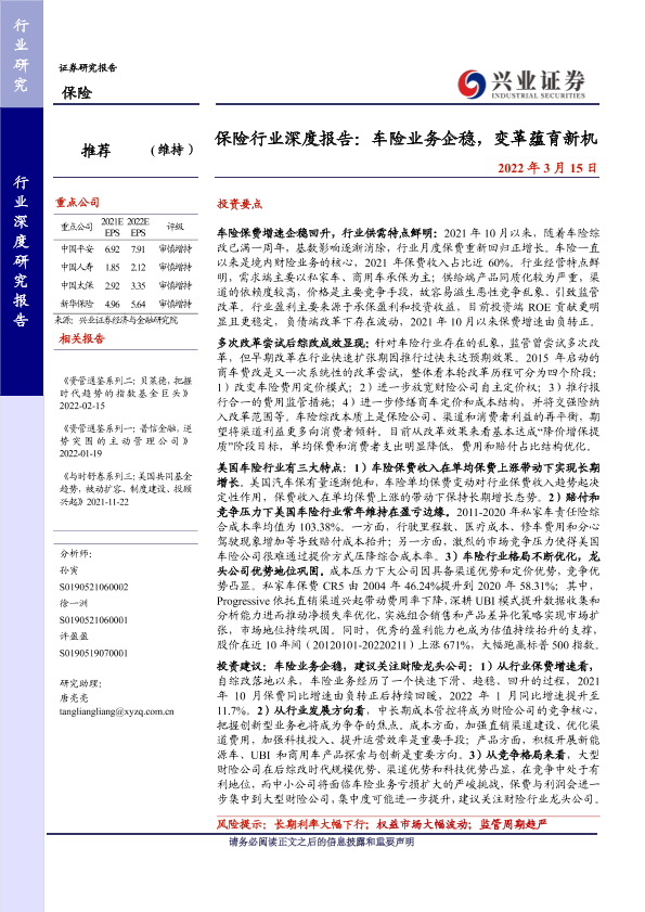 【兴业证券】【20220315】保险行业深度报告:车险业务企稳,变革蕴育新机-37页