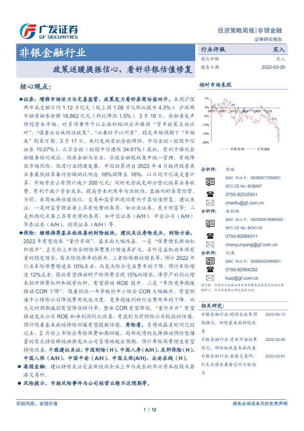 【广发证券】【20220320】非银金融行业:政策送暖提振信心,看好非银估值修复-12页