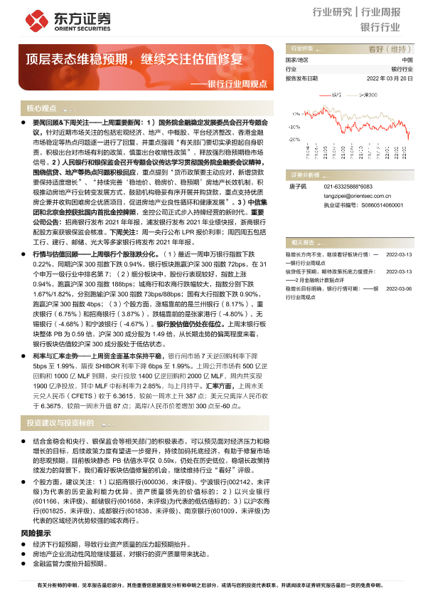 【东方证券】【20220320】银行行业周观点:顶层表态维稳预期,继续关注估值修复-13页