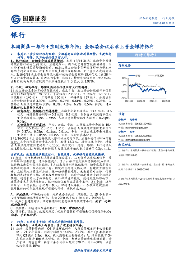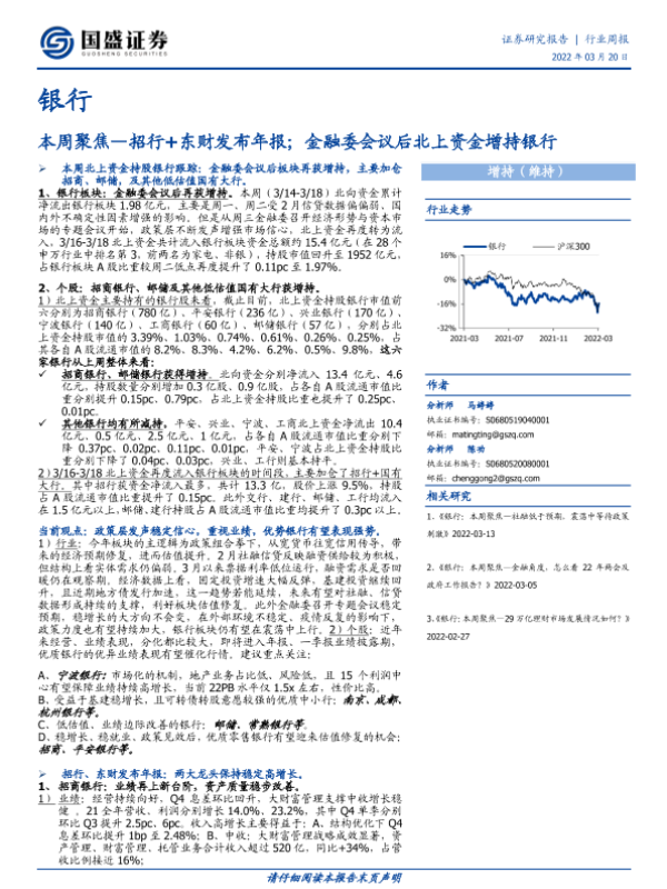 【国盛证券】【20220320】银行行业周报:本周聚焦—招行+东财发布年报;金融委会议后北上资金增持银行-15页
