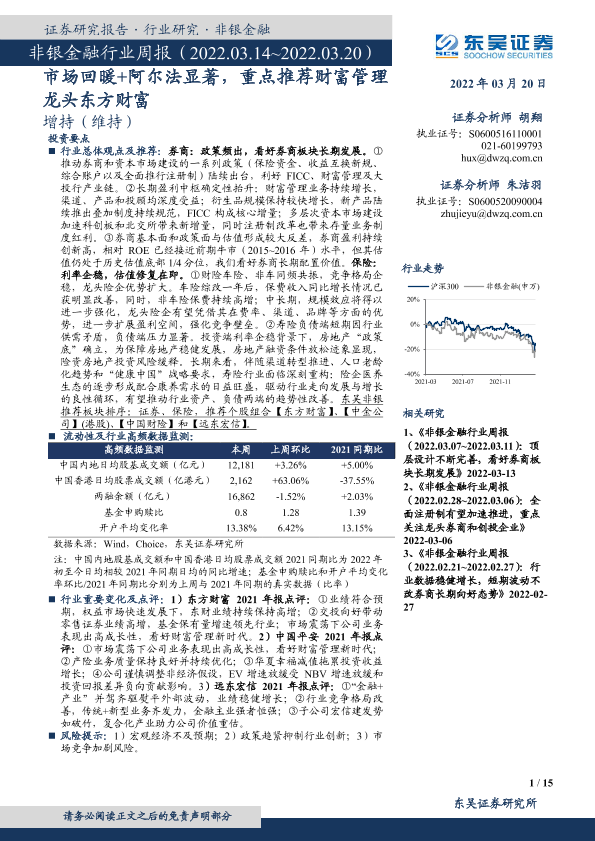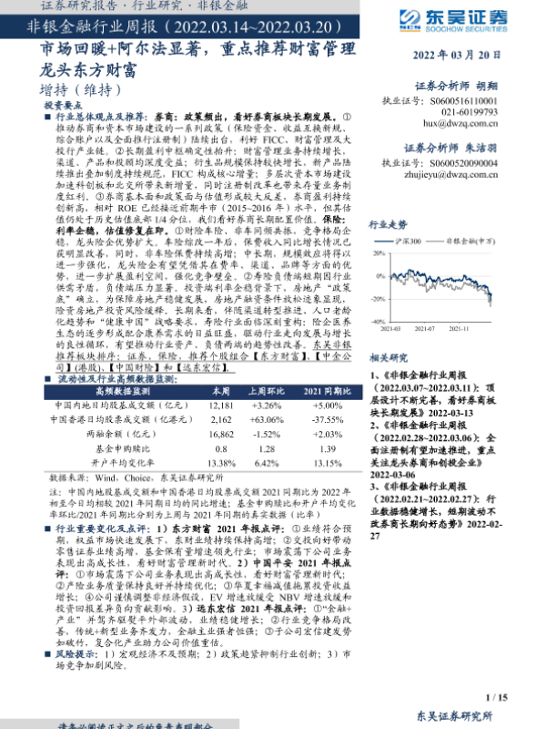 【东吴证券】【20220320】非银金融行业周报:市场回暖+阿尔法显著,重点推荐财富管理龙头东方财富-15页