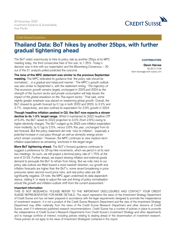 【Credit Suisse Economics】【20221130】泰国央行再次加息25个基点,未来将继续逐步收紧-3页